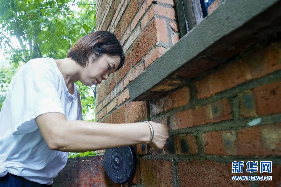7月1日,地質(zhì)災(zāi)害監(jiān)測員侯芳對(duì)一處農(nóng)房的墻上裂縫寬度進(jìn)行測量。新華社記者劉潺攝