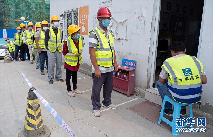 7月2日,在北京市大興區(qū)中建三局二公司北京公司一項目建筑工地的臨時核酸檢測采樣點,建筑工地人員排隊等候采樣。
