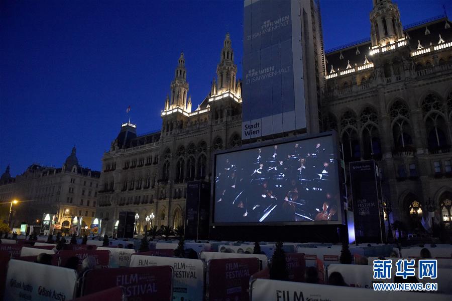7月4日,觀眾們在奧地利首都維也納市政廳廣場內(nèi)場一個個獨立小區(qū)域內(nèi)觀看維也納電影節(jié)開幕電影——貝多芬的歌劇《菲岱利奧》。新華社記者郭晨攝