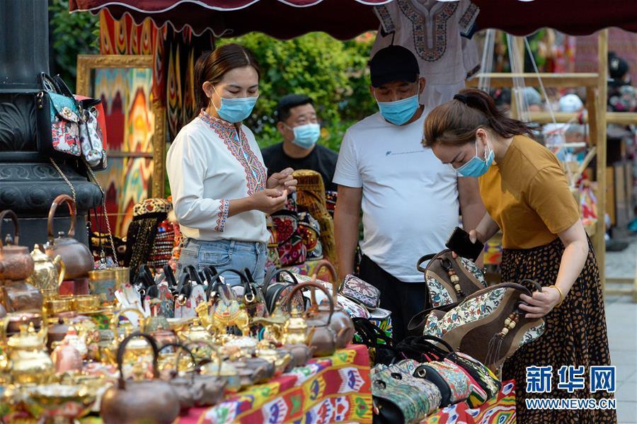 游客在烏魯木齊大巴扎景區(qū)選購商品(7月4日攝)。夏日周末,烏魯木齊市大巴扎景區(qū)內(nèi)熙熙攘攘,人們來到這里品嘗美食、休閑購物。2018年,經(jīng)過靚化改造后的大巴扎景區(qū)新增長約800米的步行街,分為文創(chuàng)文旅和“非遺”項(xiàng)目街區(qū)、國際時(shí)尚街區(qū)和大巴扎美食街區(qū),是烏魯木齊最受歡迎的旅游目的地之一。新華社記者丁磊攝