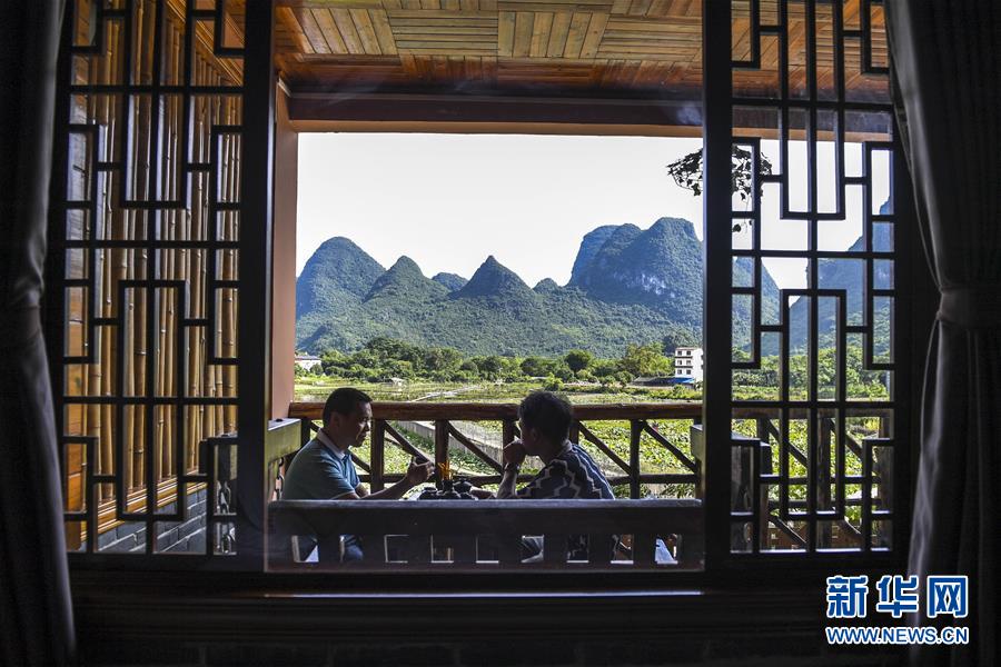 7月4日,游客在廣西陽(yáng)朔縣一家民宿的陽(yáng)臺(tái)上喝茶聊天。新華社記者曹祎銘攝