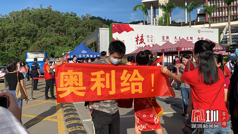 考生學(xué)長(zhǎng)來(lái)到深圳紅嶺中學(xué)考點(diǎn)門(mén)口為學(xué)弟舉起“奧利給”的旗子。