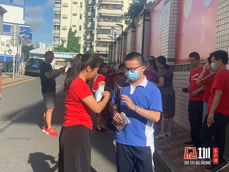 身穿紅色衣服的家長們預祝考生們旗開得勝。