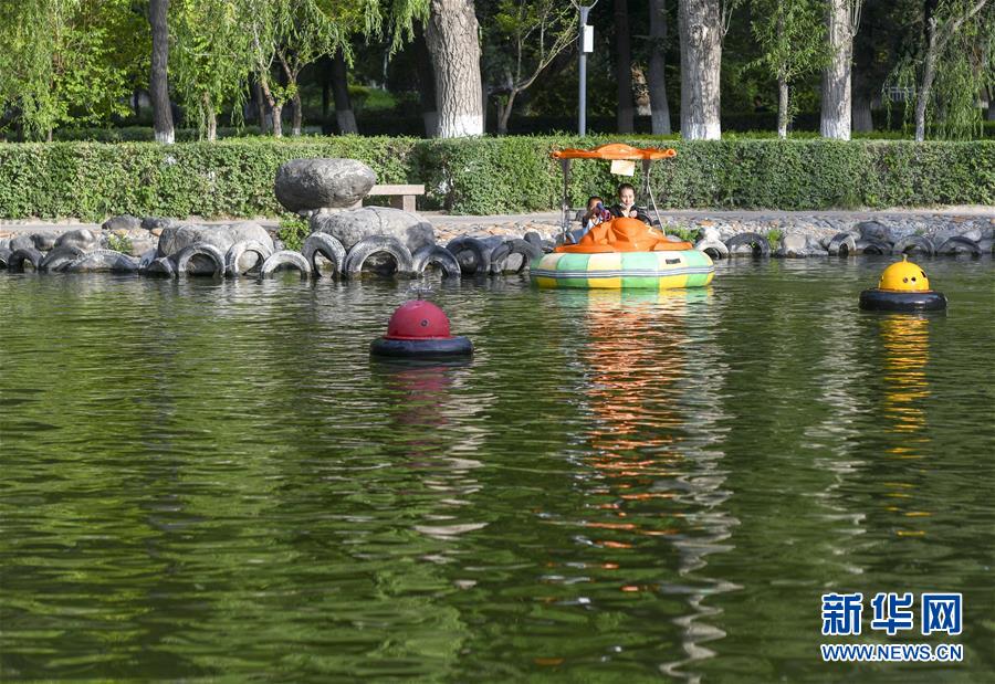 在烏魯木齊人民公園,市民在湖面劃船游玩(7月5日攝)。新華社記者趙戈攝