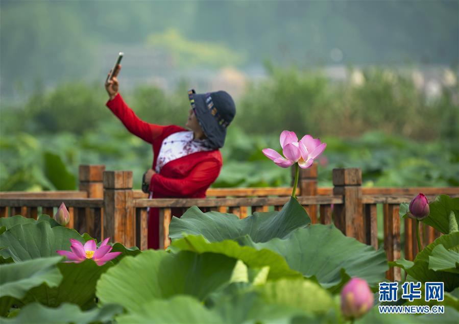 7月7日,游客在唐山市南湖公園內(nèi)的觀荷棧橋上拍照。近日,河北省唐山市南湖公園內(nèi)荷花競(jìng)相綻放,呈現(xiàn)出“接天蓮葉無(wú)窮碧,映日荷花別樣紅”的美麗景象,吸引了眾多游客前來(lái)觀賞。新華社記者楊世堯攝