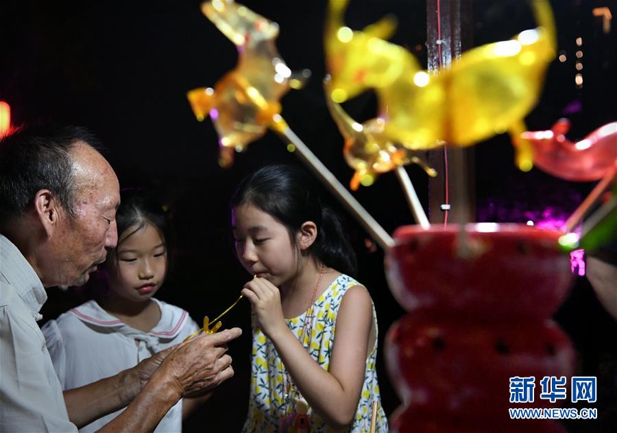 7月7日晚,小朋友在洛陽洛邑古城內(nèi)吹糖人。近日,河南洛陽的夜晚愈發(fā)繽紛多彩。立足于厚重的隋唐文化底蘊,洛陽正通過創(chuàng)新夜游產(chǎn)品打響“古都夜八點”品牌,激活文旅消費。新華社記者李安攝