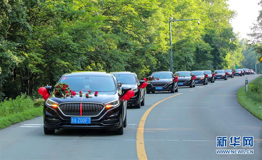 7月8日,載有新人的車輛前往長白山北景區(qū)婚禮現(xiàn)場。新華社記者林宏攝