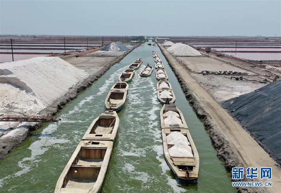 7月9日,唐山市曹妃甸區(qū)南堡鹽場的工人將收獲的春鹽裝船。在我國長蘆鹽區(qū)海鹽生產(chǎn)基地之一的河北省唐山市曹妃甸區(qū)南堡鹽場,一年一度的春鹽收獲工作即將結(jié)束,今年南堡鹽場的春鹽產(chǎn)量預(yù)計(jì)可達(dá)72萬噸。新華社記者楊世堯攝