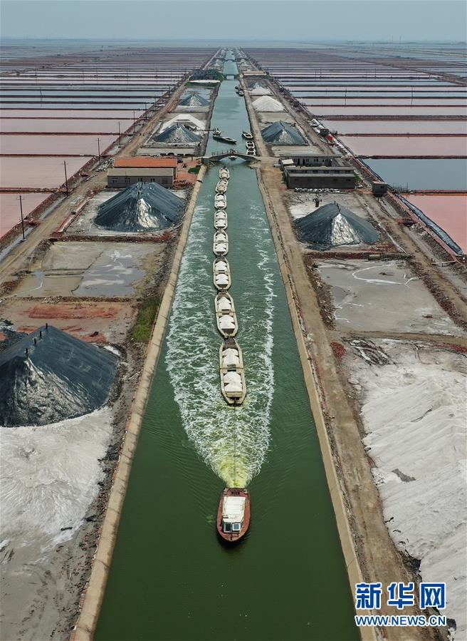 7月9日,唐山市曹妃甸區(qū)南堡鹽場的運(yùn)鹽船只在運(yùn)輸河道內(nèi)行駛(無人機(jī)照片)。在我國長蘆鹽區(qū)海鹽生產(chǎn)基地之一的河北省唐山市曹妃甸區(qū)南堡鹽場,一年一度的春鹽收獲工作即將結(jié)束,今年南堡鹽場的春鹽產(chǎn)量預(yù)計(jì)可達(dá)72萬噸。新華社記者楊世堯攝