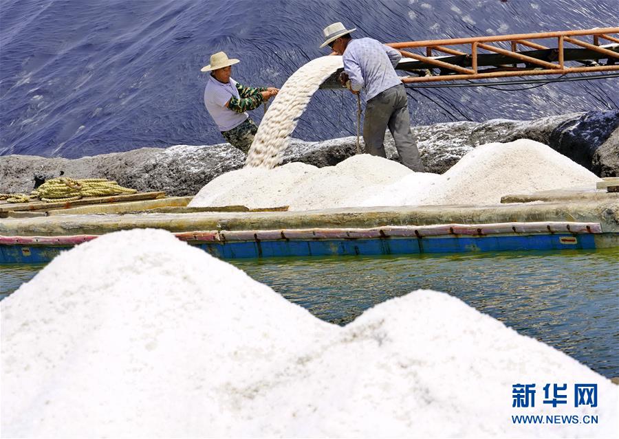 7月9日,唐山市曹妃甸區(qū)南堡鹽場(chǎng)的工人將收獲的春鹽裝船。在我國(guó)長(zhǎng)蘆鹽區(qū)海鹽生產(chǎn)基地之一的河北省唐山市曹妃甸區(qū)南堡鹽場(chǎng),一年一度的春鹽收獲工作即將結(jié)束,今年南堡鹽場(chǎng)的春鹽產(chǎn)量預(yù)計(jì)可達(dá)72萬噸。新華社記者楊世堯攝