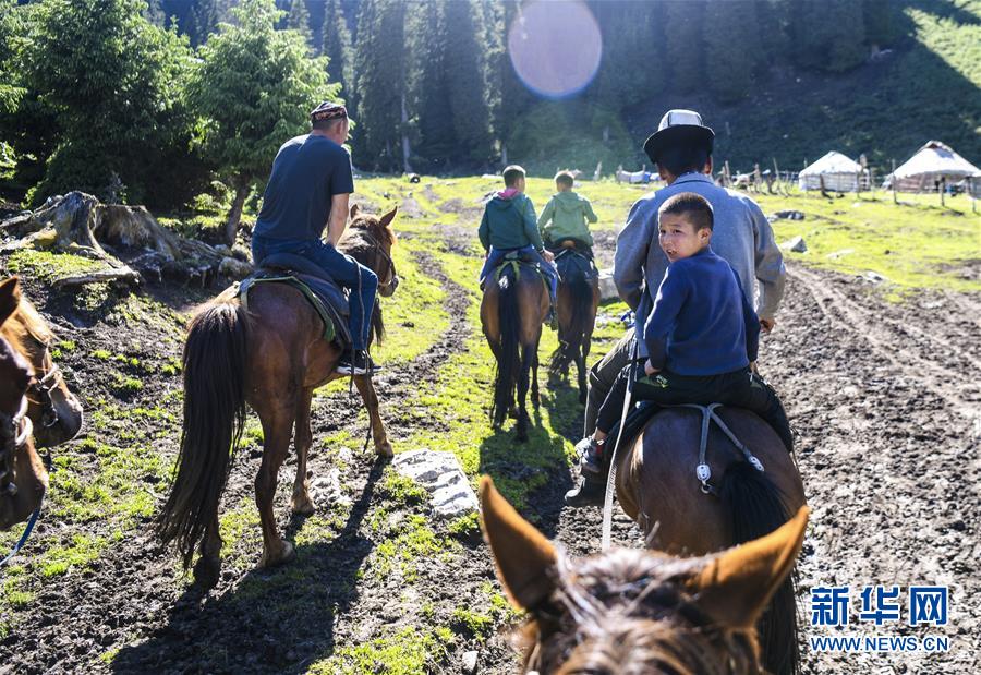 在新疆特克斯縣境內(nèi)的夏牧場里,小朋友跟隨家人一起放牧(6月30日攝)。新華社記者王菲攝