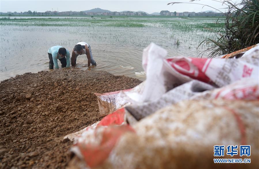 7月9日,為應(yīng)對洪峰到來,邵忠如(左)在水中加固圩堤。新華社記者萬象攝
