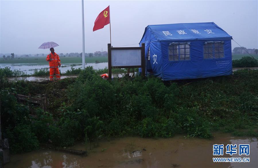 7月9日,邵忠如在圩堤上的救災(zāi)棚旁觀察水情。新華社記者萬象攝