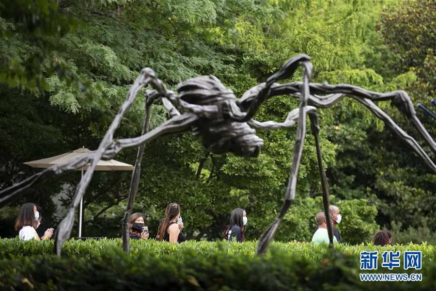 7月11日,在美國(guó)華盛頓,人們戴著口罩在國(guó)家藝術(shù)畫(huà)廊雕塑公園游覽。新華社記者劉杰攝