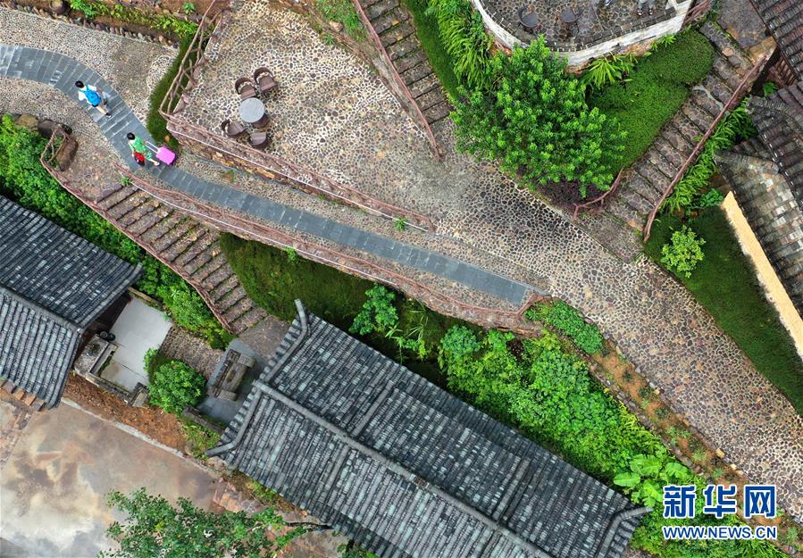 7月11日,游客行走在金秀瑤族自治縣六巷鄉(xiāng)一處民宿內(nèi)(無人機(jī)照片)。近年來,廣西金秀瑤族自治縣依托當(dāng)?shù)刈匀簧鷳B(tài)優(yōu)勢,圍繞境內(nèi)豐富的瑤族文化,大力發(fā)展鄉(xiāng)村旅游,精心打造一批獨(dú)具瑤族特色的山間民宿酒店,取得良好經(jīng)濟(jì)效益。新華社記者 周華 攝