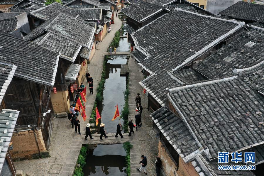 7月4日,浦源村民展示魚祭習俗(無人機照片)。魚祭習俗是為死去的鯉魚舉行送葬儀式,是浦源村特有的習俗。新華社記者 姜克紅 攝