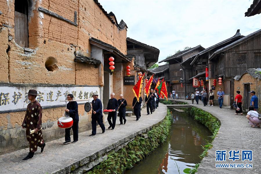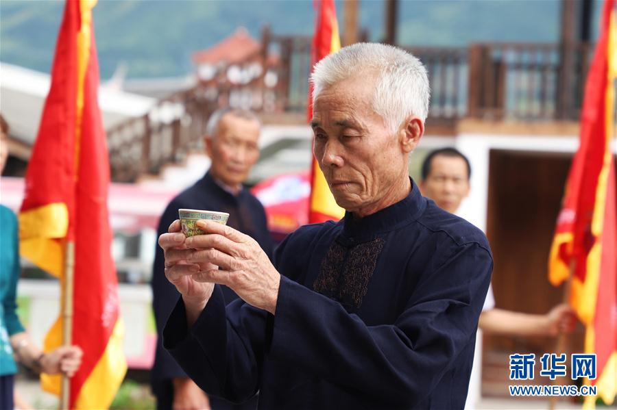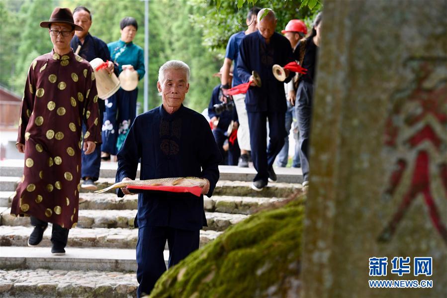 7月4日,浦源村民展示魚祭習俗。魚祭習俗是為死去的鯉魚舉行送葬儀式,是浦源村特有的習俗。新華社記者 姜克紅 攝