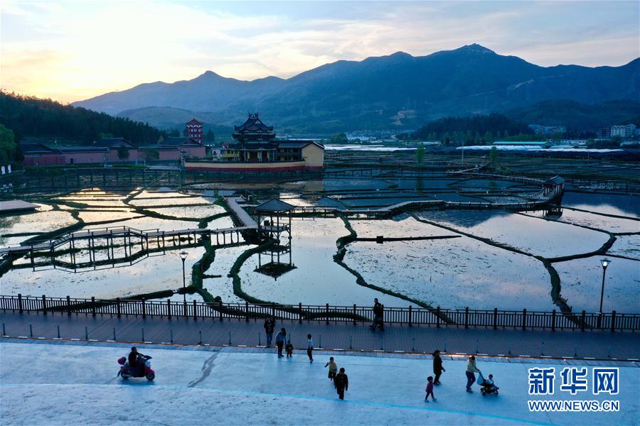 4月17日傍晚時分,人們在浦源村鯉魚溪公園散步休閑(無人機照片)。新華社記者 姜克紅 攝