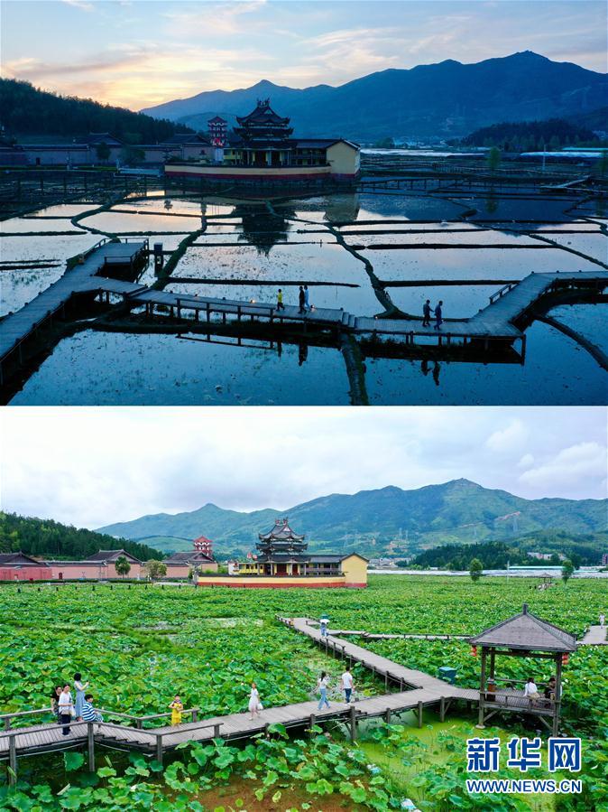 拼版照片:人們在浦源村鯉魚溪公園內游覽(上圖為4月17日拍攝;下圖為7月3日拍攝)。新華社記者 姜克紅 攝