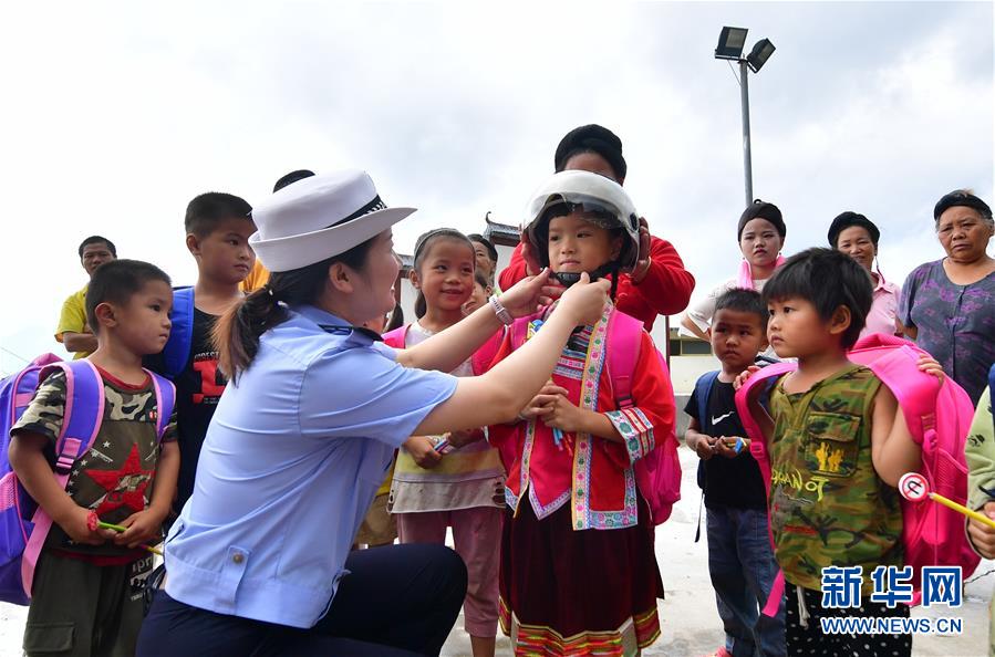 7月11日,柳州市交警支隊(duì)民警指導(dǎo)小朋友正確佩戴頭盔。當(dāng)日,廣西柳州市交警支隊(duì)的民警來到融水苗族自治縣大浪鎮(zhèn)大新村紅鄧屯教學(xué)點(diǎn),開展暑期交通安全教育活動(dòng),增強(qiáng)孩子們的安全出行意識(shí)。新華社記者黃孝邦攝