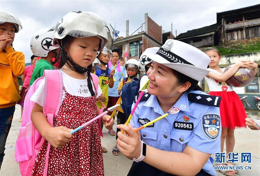 7月11日,柳州市交警支隊(duì)民警給小朋友贈(zèng)送交通標(biāo)志鉛筆。當(dāng)日,廣西柳州市交警支隊(duì)的民警來到融水苗族自治縣大浪鎮(zhèn)大新村紅鄧屯教學(xué)點(diǎn),開展暑期交通安全教育活動(dòng),增強(qiáng)孩子們的安全出行意識(shí)。新華社記者黃孝邦攝