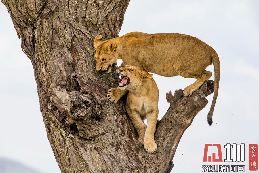 2020年7月13日報(bào)道(具體拍攝時(shí)間不詳),Sandesh Kadur是一名印度野生動(dòng)物攝影師,他在坦桑尼亞塞倫蓋蒂國家公園拍攝到一系列“獅子上樹”的精彩照片。畫面中,有一只憤怒的母獅為了捍衛(wèi)自己在樹上的位置,一邊劈叉一邊對著鏡頭咆哮,有兩只獅子為了爭奪位置互相攻擊,還有一只獅子在找到舒適的位置后呼呼大睡。