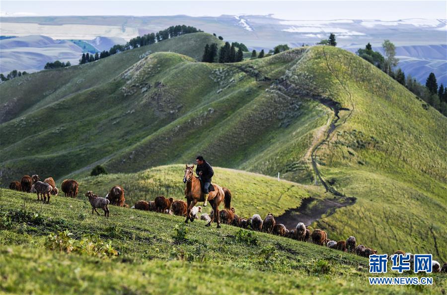 在新疆伊犁特克斯縣境內(nèi)的夏牧場(chǎng)里,一位牧民在放牧(7月2日攝)。新華社記者 王菲 攝