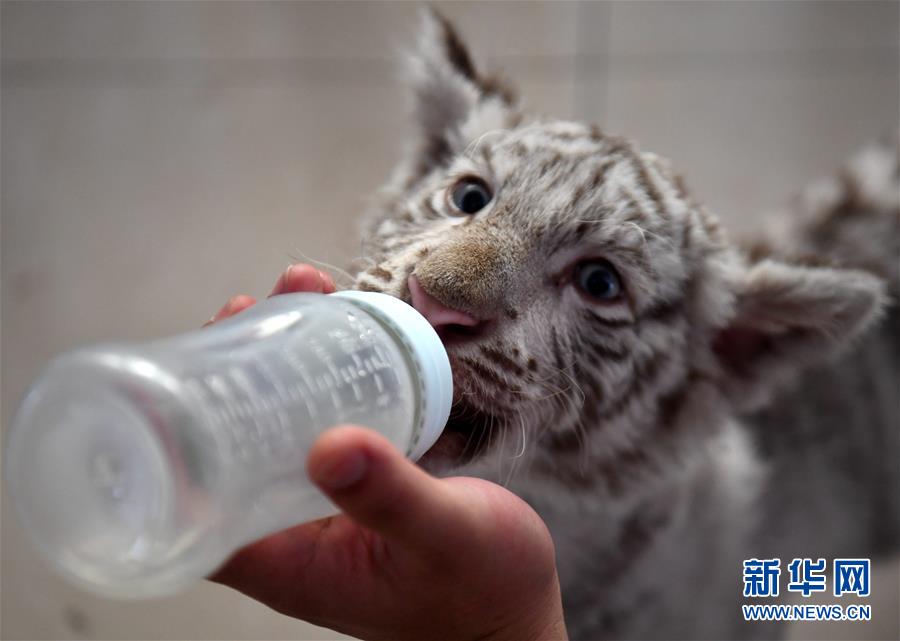 7月13日,工作人員給“妞妞”喂水。河北石家莊市動物園的孟加拉白虎寶寶“妞妞”只有3個(gè)月大,由于虎媽媽經(jīng)驗(yàn)不足,“妞妞”一出生便由動物園工作人員按科學(xué)方法人工飼養(yǎng)。目前,在飼養(yǎng)員的精心照料下,“妞妞”正在茁壯成長。新華社記者 王曉 攝