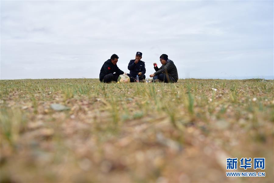 在可可西里索南達(dá)杰保護(hù)站,龍周才加(中)與隊友才仁多杰(左)、王文豪在管護(hù)區(qū)域巡查時吃午飯(6月30日攝)。新華社記者 張龍 攝