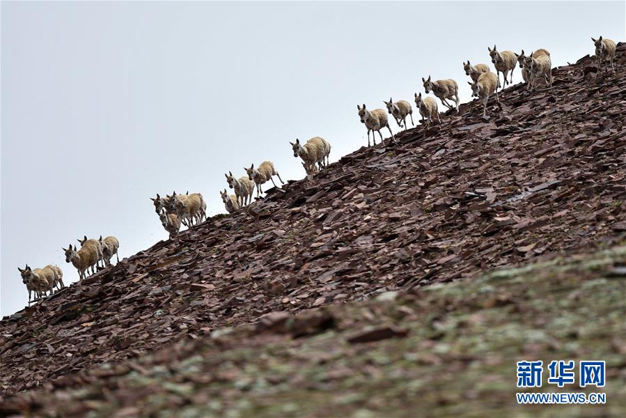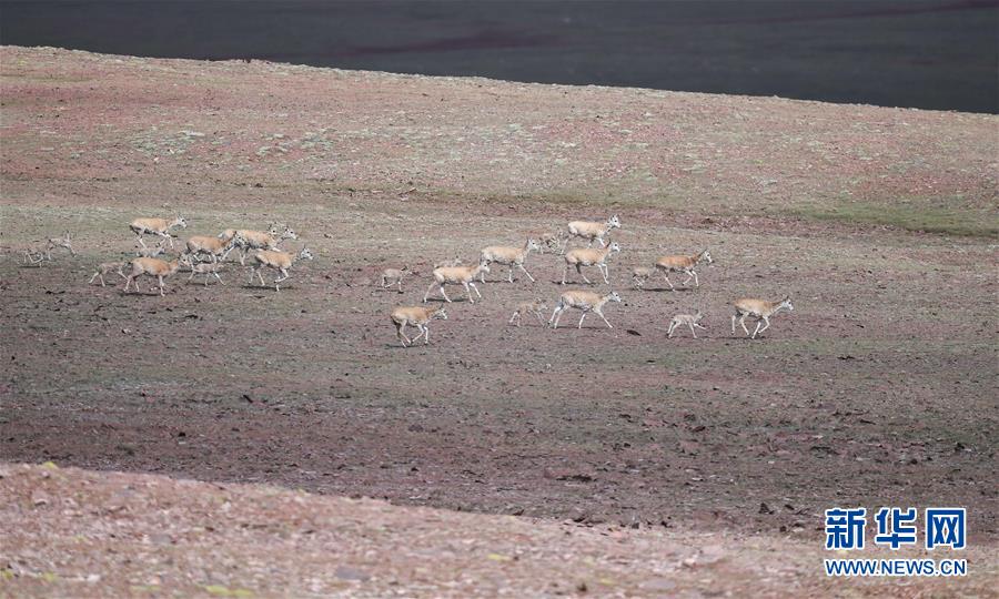 7月7日在可可西里卓乃湖區(qū)域拍攝的藏羚羊。目前正值藏羚羊產仔季。來自青海三江源、新疆阿爾金山、西藏羌塘等地的藏羚羊來到位于青海省可可西里腹地、被譽為“藏羚羊大產房”的卓乃湖區(qū)域產仔。新華社記者 薛玉斌 攝