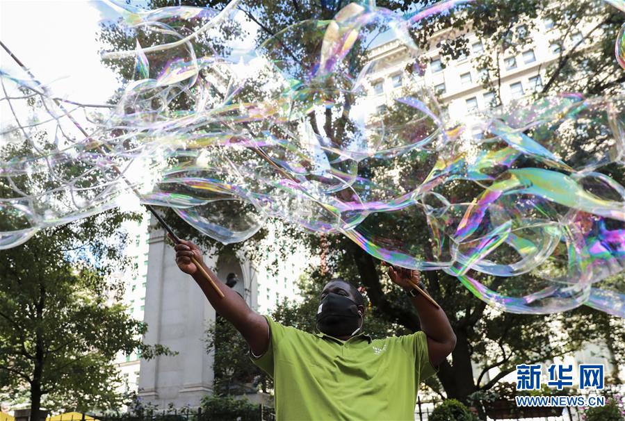 7月14日,美國(guó)紐約街頭一名戴口罩的男子表演“泡泡秀”。美國(guó)約翰斯·霍普金斯大學(xué):截至北京時(shí)間15日6時(shí)34分,全球新冠確診病例達(dá)13258016例,死亡病例為576752例。美國(guó)是全球疫情最嚴(yán)重的國(guó)家,確診病例達(dá)3416222例,死亡病例為136319例。新華社記者 王迎 攝
