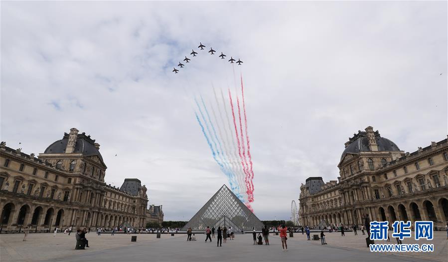 7月14日,“法蘭西巡邏兵”飛行表演隊(duì)飛過(guò)法國(guó)巴黎盧浮宮玻璃金字塔廣場(chǎng)。法國(guó)一年一度的國(guó)慶閱兵式14日在巴黎舉行。受疫情影響,法國(guó)總統(tǒng)馬克龍沒有在香榭麗舍大街舉行國(guó)慶閱兵式,而是在協(xié)和廣場(chǎng)舉行小型慶祝儀式,向在抗疫斗爭(zhēng)中做出貢獻(xiàn)的公民致敬。新華社記者高靜攝