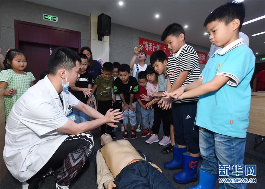 7月16日,東林鎮(zhèn)衛(wèi)生院的醫(yī)護(hù)人員(左一)在給學(xué)生們示范和講解心肺復(fù)蘇的操作知識。當(dāng)日,浙江省湖州市吳興區(qū)東林鎮(zhèn)舉辦暑期“安全防護(hù)小超人”主題活動?;顒佑舍t(yī)護(hù)人員、消防隊(duì)員等為學(xué)生及家長講授日常安全避險及溺水急救知識,中小學(xué)們還在現(xiàn)場學(xué)習(xí)了簡易包扎、心肺復(fù)蘇的正確方式,并了解滅火器、滅火毯等消防器材的使用,為學(xué)生平安過暑期打好安全防護(hù)“預(yù)防針”。新華社記者 徐昱 攝