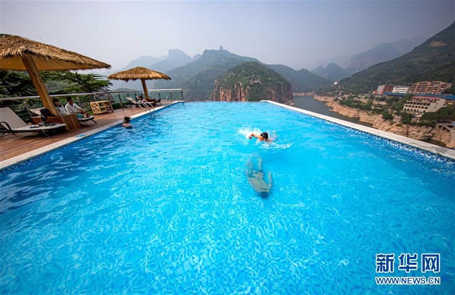7月15日,游客在武安市活水鄉(xiāng)松林山莊民宿內(nèi)游泳。新華社記者 王曉 攝