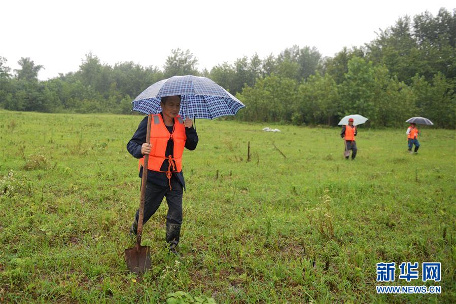 7月16日,鐵銅鄉(xiāng)新豐村的抗洪搶險(xiǎn)隊(duì)員鮑大友(左)和隊(duì)友在圩堤上巡堤查險(xiǎn)。受長江持續(xù)高水位影響,安徽省樅陽縣的鐵銅鄉(xiāng)江心洲已于近日將江心洲上的居民轉(zhuǎn)移安置,而包括搶險(xiǎn)隊(duì)員、鄉(xiāng)鎮(zhèn)干部、水利工程師等在內(nèi)的近300人“留守”在江心洲上巡堤查險(xiǎn),守護(hù)家園。鐵銅鄉(xiāng)位于長江江心洲上,有4個(gè)行政村52個(gè)村民組,耕地面積12000多畝。新華社記者黃博涵攝