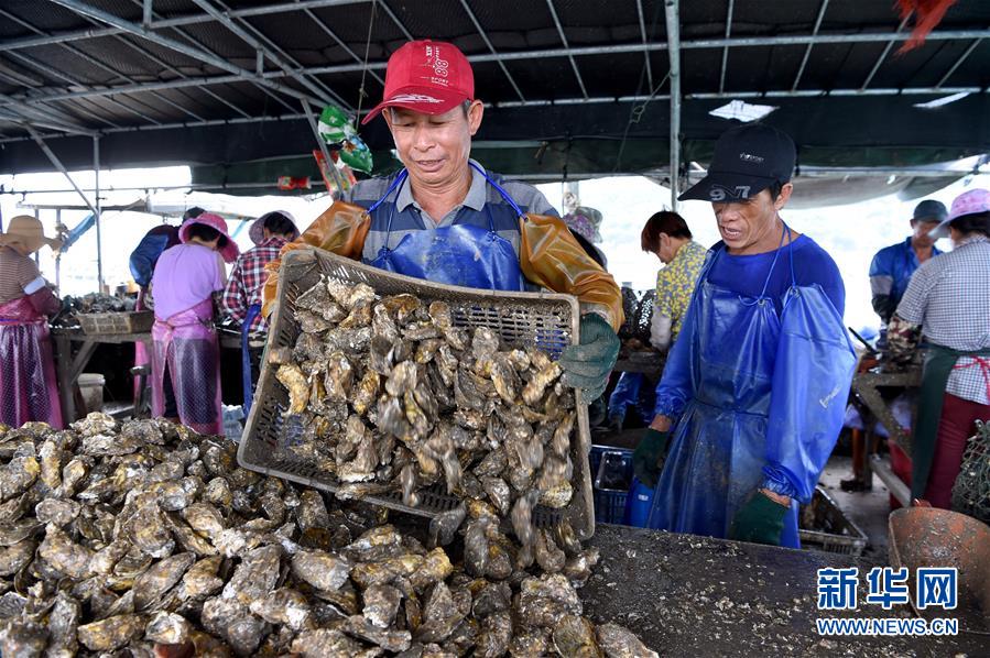 7月16日,在福建省霞浦縣長春鎮(zhèn)秋竹崗村養(yǎng)殖大戶俞開明的海上分揀平臺,工人們在分揀生蠔。新華社記者姜克紅攝