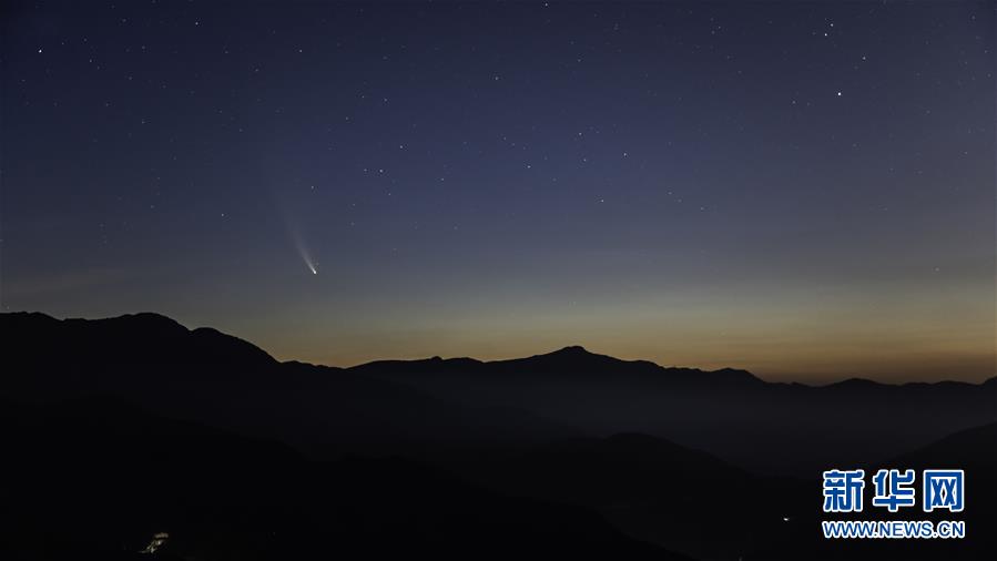 7月16日凌晨,在北京郊區(qū)拍攝的尼歐懷茲彗星劃過天際。新華社記者孟鼎博攝