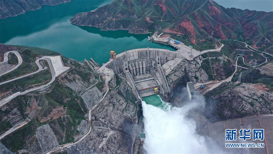 7月9日,位于青海省尖扎縣和化隆縣交界處的李家峽水電站提門泄水(無人機(jī)照片)。新華社記者吳剛攝