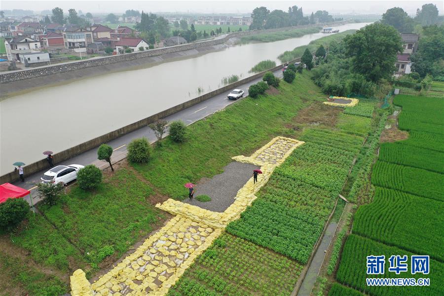 在鎮(zhèn)江市丹徒區(qū)世業(yè)鎮(zhèn)先鋒村西南大堤,中國(guó)安能集團(tuán)第二工程局常州分公司防汛前置備勤隊(duì)員在用木樁固定捆好的蘆葦(7月17日攝,無人機(jī)照片)。捆蘆葦護(hù)邊坡、機(jī)器人進(jìn)涵洞、“養(yǎng)水盆”防滲漏……在江蘇鎮(zhèn)江,當(dāng)?shù)馗刹咳罕姾蛯I(yè)力量,因地制宜就地取材,老辦法搭配新技術(shù),一批險(xiǎn)情得以消除在萌芽狀態(tài)。新華社記者季春鵬攝