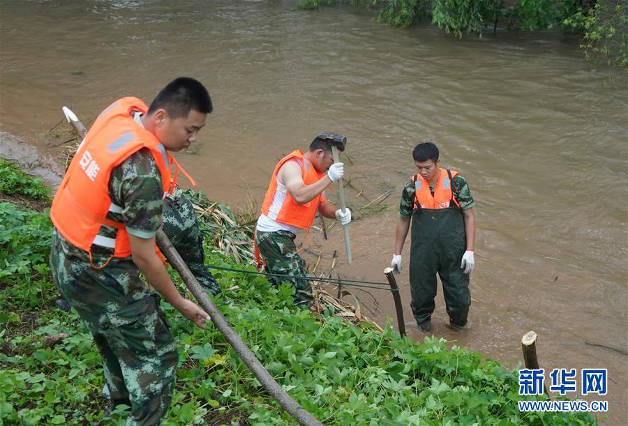 在鎮(zhèn)江市丹徒區(qū)世業(yè)鎮(zhèn)先鋒村西南大堤,中國(guó)安能集團(tuán)第二工程局常州分公司防汛前置備勤隊(duì)員在打樁,用來固定捆好的蘆葦(7月17日攝)。捆蘆葦護(hù)邊坡、機(jī)器人進(jìn)涵洞、“養(yǎng)水盆”防滲漏……在江蘇鎮(zhèn)江,當(dāng)?shù)馗刹咳罕姾蛯I(yè)力量,因地制宜就地取材,老辦法搭配新技術(shù),一批險(xiǎn)情得以消除在萌芽狀態(tài)。新華社記者季春鵬攝