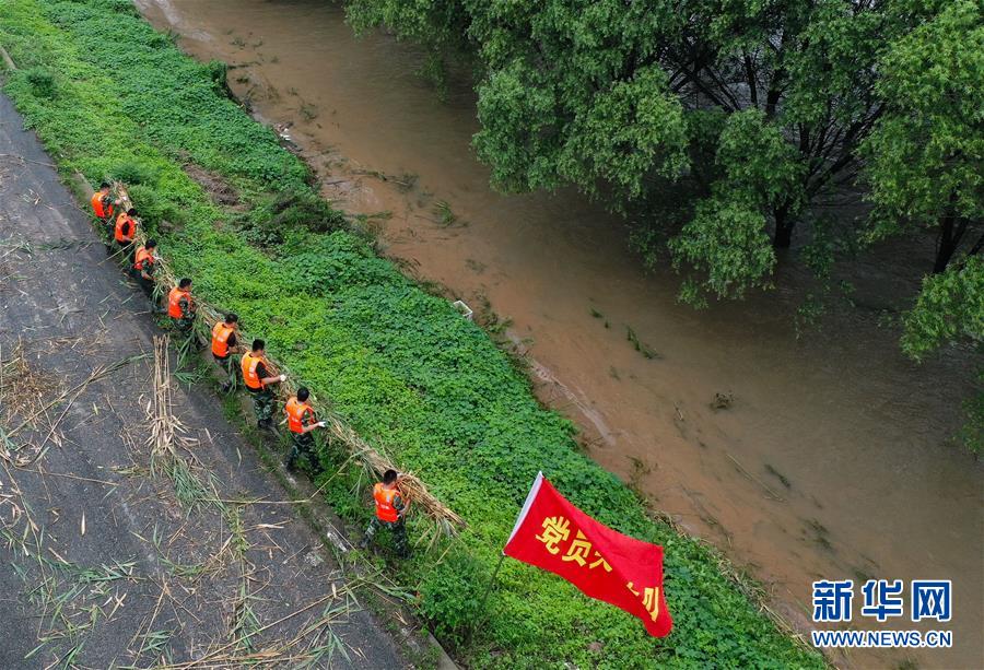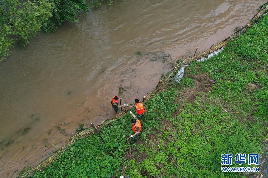 在鎮(zhèn)江市丹徒區(qū)世業(yè)鎮(zhèn)先鋒村西南大堤,中國(guó)安能集團(tuán)第二工程局常州分公司防汛前置備勤隊(duì)員在捆蘆葦護(hù)邊坡(7月17日攝)。捆蘆葦護(hù)邊坡、機(jī)器人進(jìn)涵洞、“養(yǎng)水盆”防滲漏……在江蘇鎮(zhèn)江,當(dāng)?shù)馗刹咳罕姾蛯I(yè)力量,因地制宜就地取材,老辦法搭配新技術(shù),一批險(xiǎn)情得以消除在萌芽狀態(tài)。新華社記者季春鵬攝
