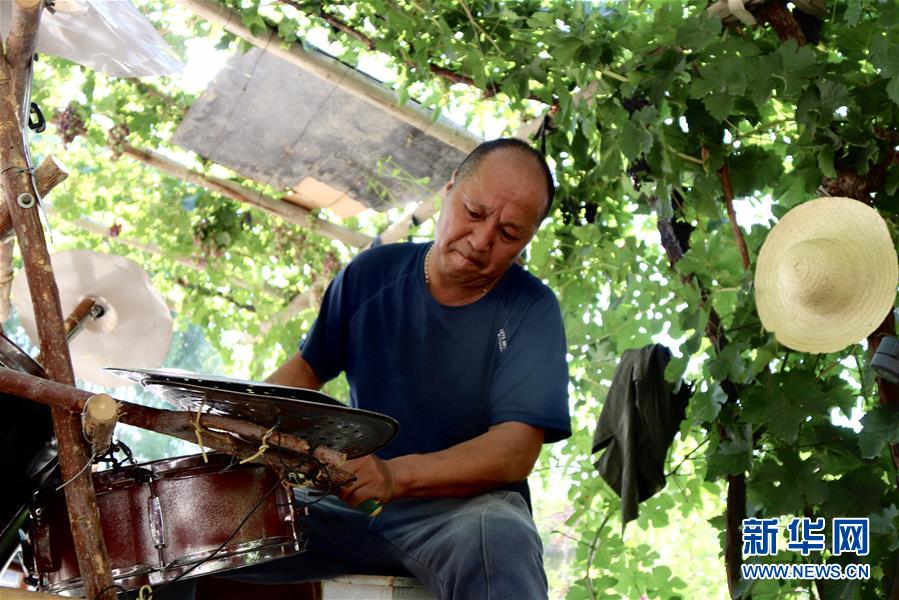 張宏遠(yuǎn)在位于新疆瑪納斯縣的自家院落里維修自制的架子鼓(7月14日攝)。新華社記者孫哲攝