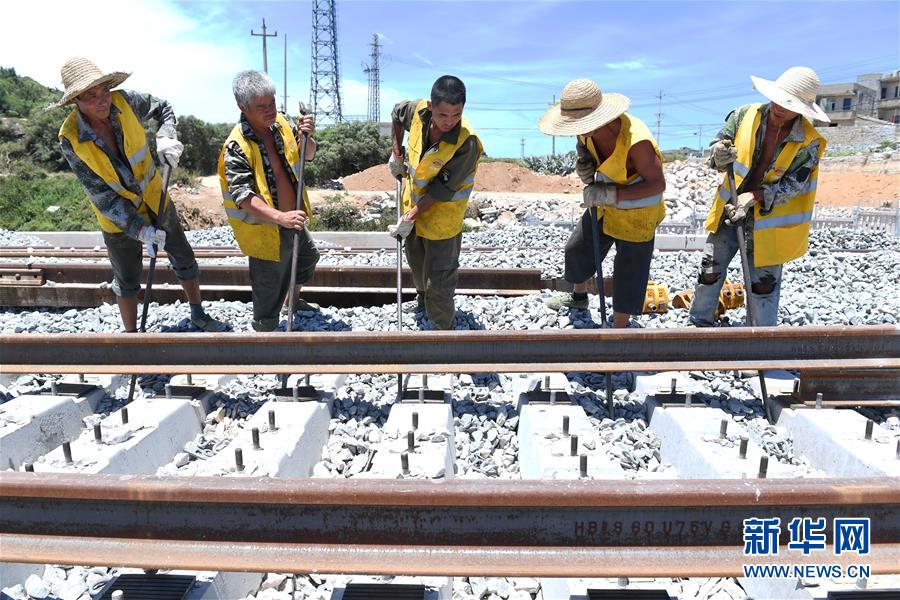 7月20日,中鐵二十四局施工人員進行平潭海峽公鐵大橋最后一根500米長軌的換鋪工作。當(dāng)日,中鐵二十四局施工人員在平潭海峽公鐵大橋進行最后一根鐵路長軌換鋪。至此,平潭海峽公鐵大橋雙線鐵路長軌全部換鋪完成。新華社記者林善傳攝