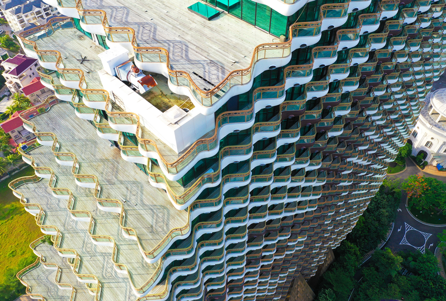 2020年7月20日,海南省三亞市,圖為航拍的“九棵大樹”建筑群。建筑物陽臺(tái)均為波浪形,視野良好,契合三亞“海”的屬性。