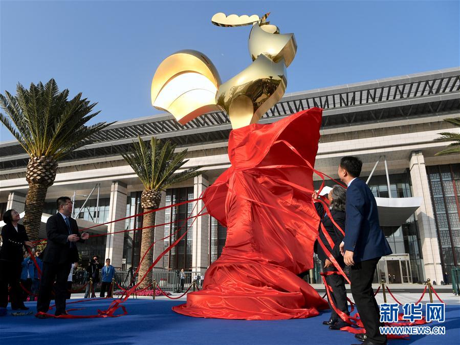 2019年11月19日,嘉賓為第28屆金雞百花電影節(jié)金雞雕塑揭幕。當(dāng)日,第28屆金雞百花電影節(jié)金雞雕塑揭幕儀式在廈門海峽大劇院前廣場舉行。新華社記者姜克紅攝
