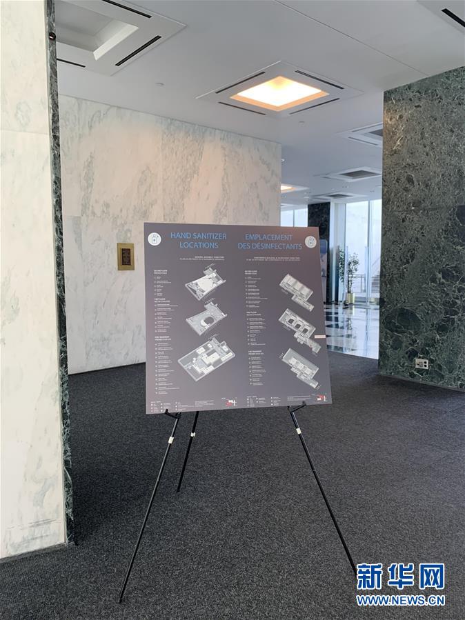 7月20日,在位于紐約的聯(lián)合國總部,秘書處大樓入口附近豎立著一塊標明消毒液擺放點的指示牌。受新冠疫情影響而實行遠程辦公4個多月的紐約聯(lián)合國總部20日進入重啟第一階段。按規(guī)定,該階段每天進入總部大樓人數(shù)不能超過400人。新華社記者王建剛攝