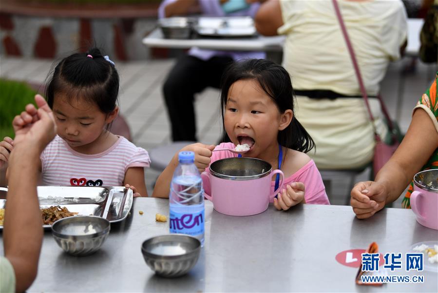 7月14日,小朋友在安徽省宿松縣洲頭鄉(xiāng)中心小學(xué)集中安置點吃晚餐。新華社記者劉軍喜攝