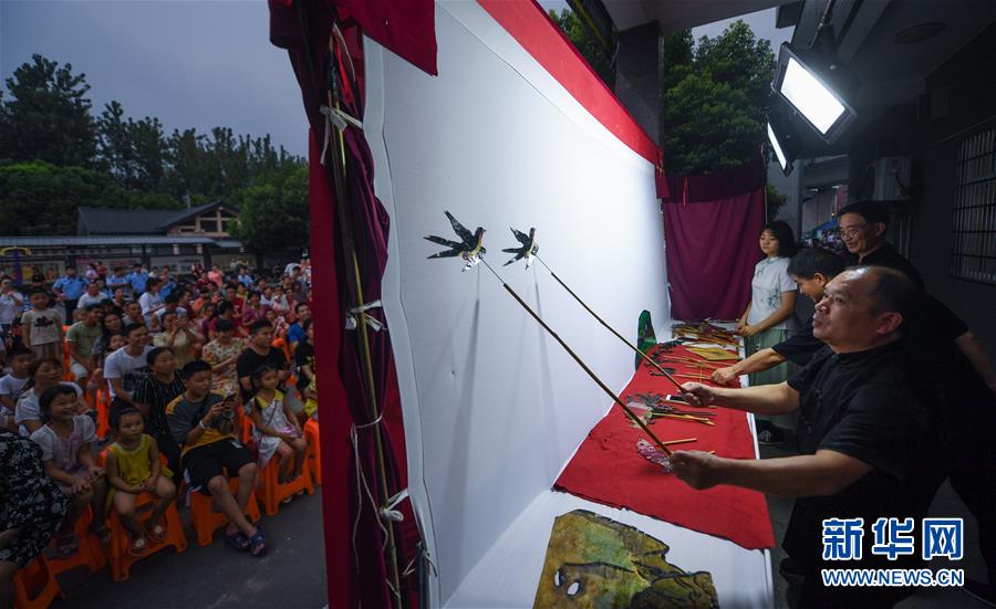 當(dāng)日,浙江省杭州市余杭區(qū)塘棲鎮(zhèn)河西埭村“衛(wèi)家班皮影戲”劇團(tuán)的藝人們來(lái)到余杭區(qū)喬司街道和睦橋村進(jìn)行演出,這是近期杭州市余杭區(qū)夏季鄉(xiāng)村“文化走親”的重要活動(dòng)之一。今年6月開(kāi)始,杭州市余杭區(qū)塘棲鎮(zhèn)組織多支文化表演團(tuán)體以“文化走親”的形式,先后送戲到余杭區(qū)近20個(gè)鄉(xiāng)村文化禮堂,豐富夏日鄉(xiāng)村百姓文化生活。在余杭塘棲一帶,歷史上曾活躍著一支以演出皮影戲出名的民間戲班子,號(hào)稱(chēng)“衛(wèi)家班”。2016年,塘棲鎮(zhèn)河西埭村在文化禮堂的建設(shè)過(guò)程中,將當(dāng)?shù)貍鹘y(tǒng)的“衛(wèi)家班皮影戲”作為“一村一品”特色項(xiàng)目進(jìn)行了搶救性保護(hù)。2018年12月,“衛(wèi)家班皮影戲”被列入杭州市非物質(zhì)文化遺產(chǎn)代表性項(xiàng)目名錄。新華社記者徐昱攝