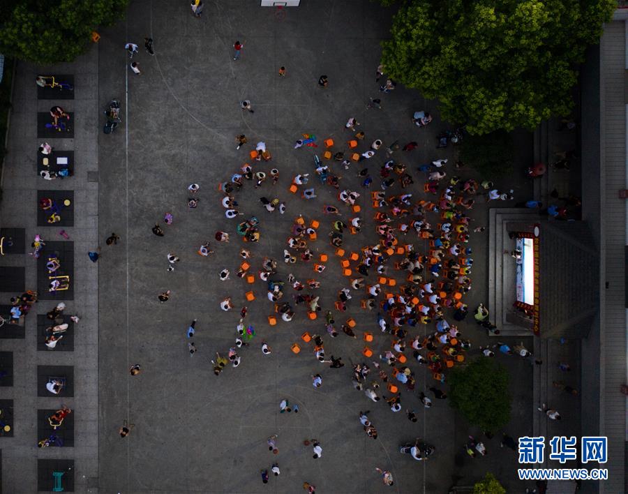 7月21日,“衛(wèi)家班皮影戲”劇團的藝人們在和睦橋村的文化禮堂前為村民們上演傳統(tǒng)皮影戲,豐富鄉(xiāng)村百姓夏季文化生活(無人機照片)。新華社記者徐昱攝