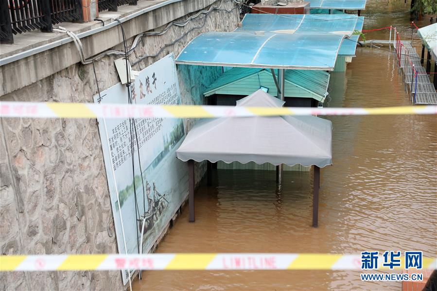 在蘭州市城關(guān)區(qū)黃河蘭州段南岸,被淹的羊皮筏子售票處門口拉上了警戒線(7月21日攝)。據(jù)了解,受降雨影響,黃河蘭州以上來(lái)水持續(xù)增加,黃河蘭州水文站7月20日20時(shí)42分流量達(dá)到3000立方米每秒,出現(xiàn)黃河2020年第2號(hào)洪水。新華社記者馬莎攝